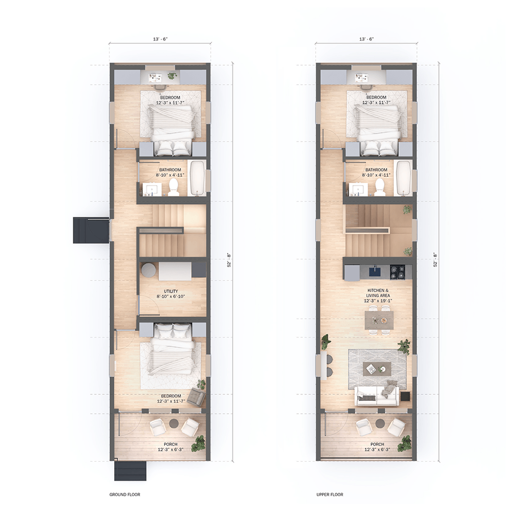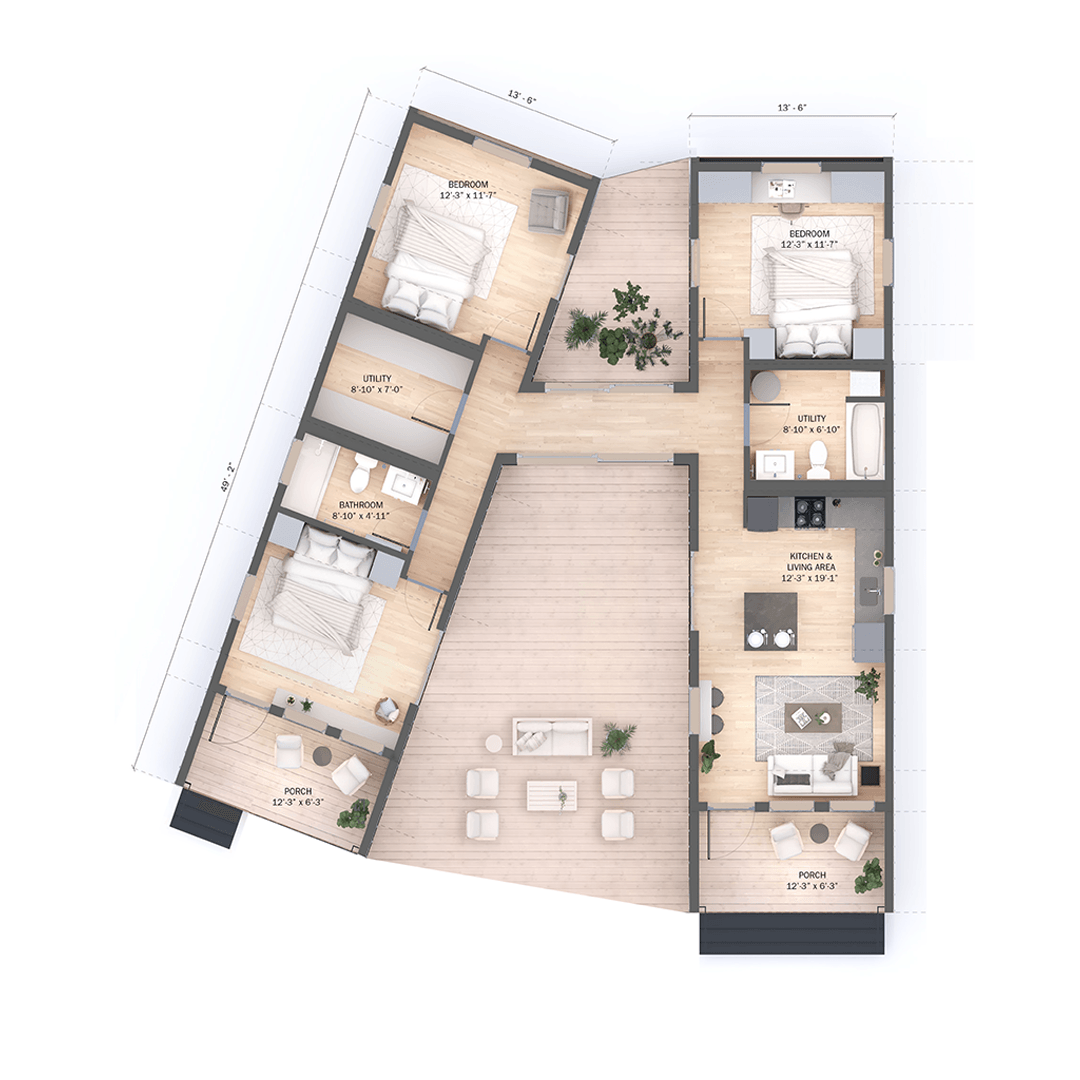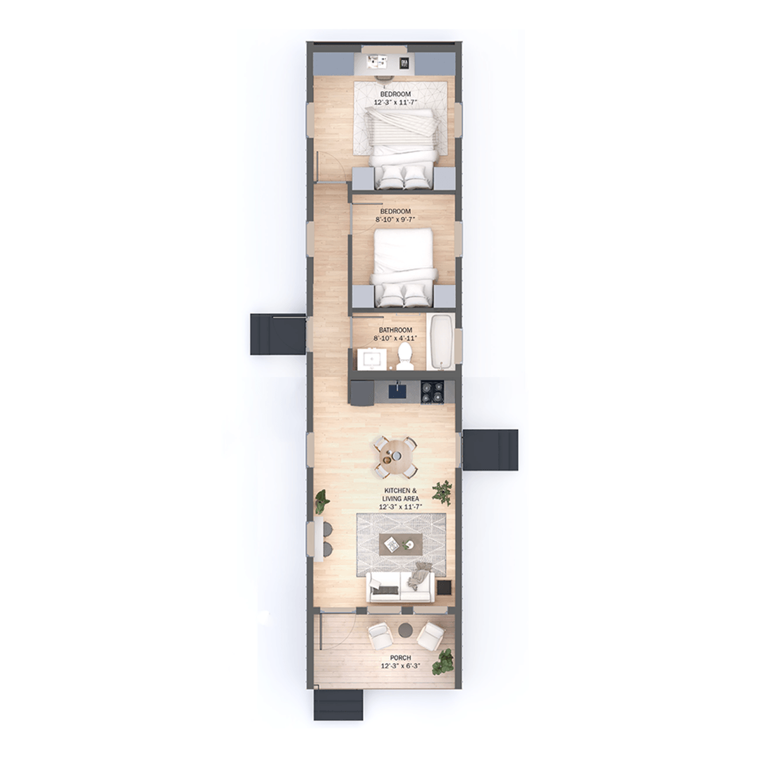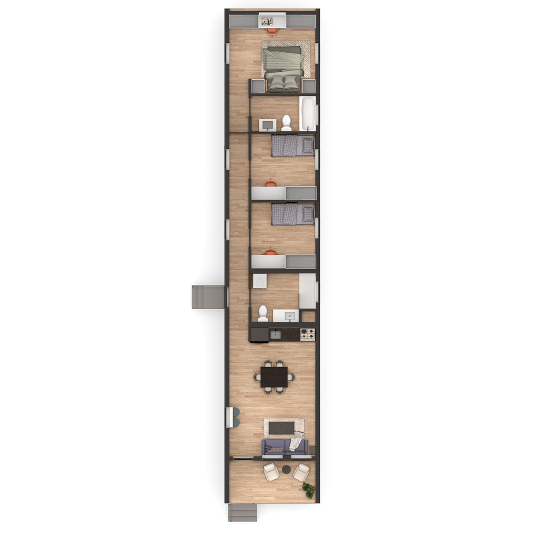 Elements of the CLiC system can be stacked and configured in various ways to create 1-5 bedroom layouts. The homes can be arranged into 1-story or 2-story buildings, and rooms can be added or subtracted as needed. Factory construction guarantees fixed costs and superior quality, compared to the uncertainty of pricing and field conditions with site building. This benefits our customers, individual buyers and developers alike.