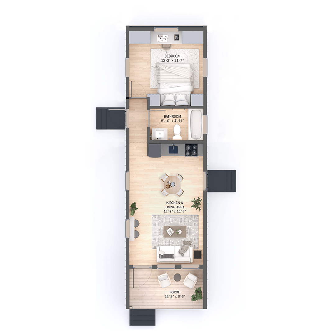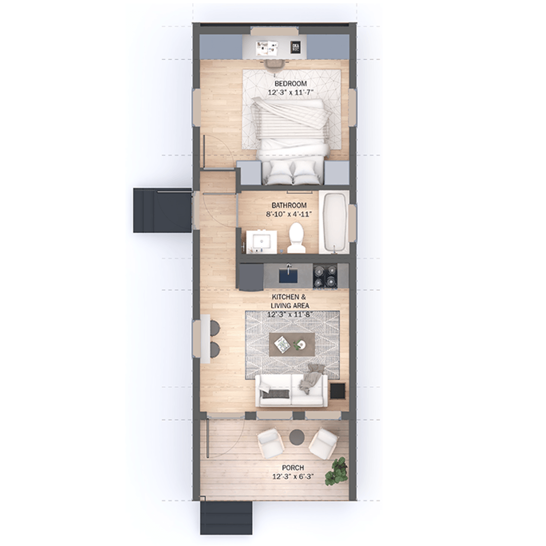 A compact, 500-square-foot modular home with 1 bedroom and 1 bathroom, designed for modern, affordable living. Perfect for individuals or couples seeking sustainable simplicity.